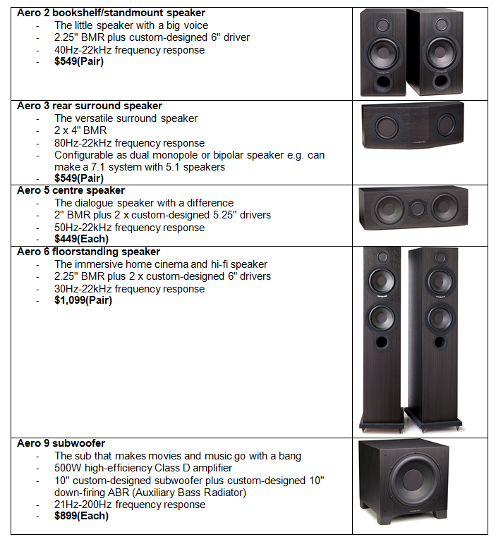 Έχουμε τα ηχεία Aero 2 βάσης, Aero 3 surround, το κεντρικό Aero 5, το βάσης Aero 6 και το subwoofer Aero 9.
